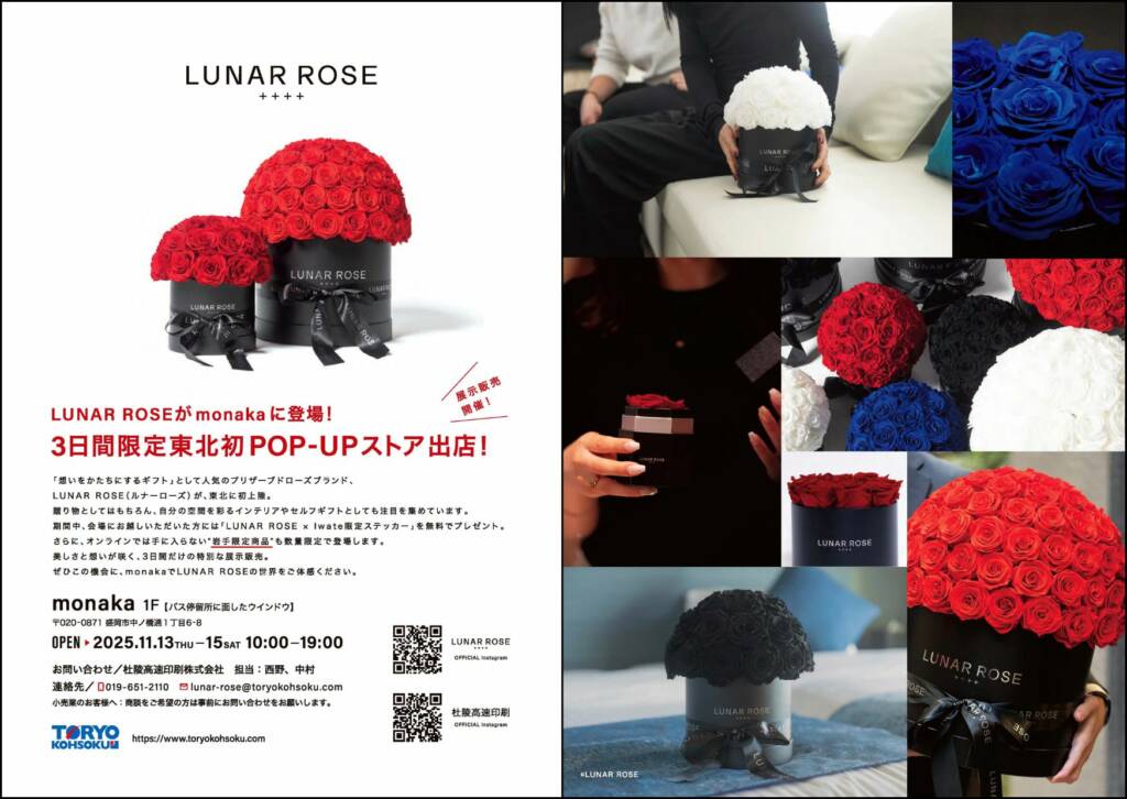 杜陵高速印刷株式会社は新事業として、株式会社LUNAR ROSE(本社:東京都渋谷区、代表取締役桑野新也氏)が展開するプリザーブドローズブランド『LUNAR ROSE』正規販売代理パートナとして共に、東北初のポップアップストアを開催いたします。